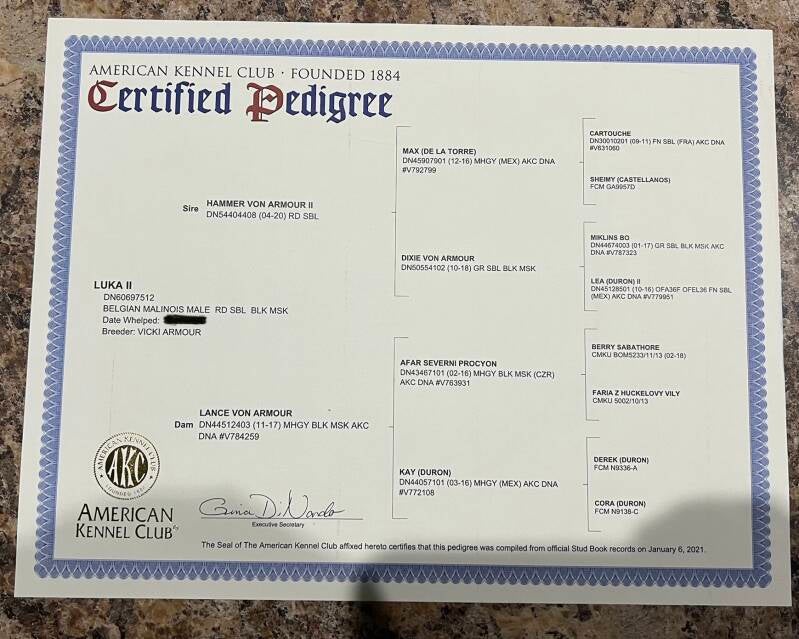 Oakland has been retired from breeding, puppies through his line will be continued through his son Hades. Hades is full certified registration/pedigree.